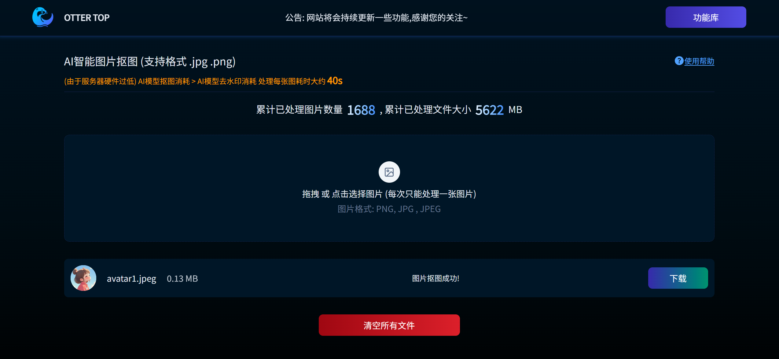 智能识别图片中的主体进行抠图,生成透明png图片 (支持 .png .jpg .jpeg)